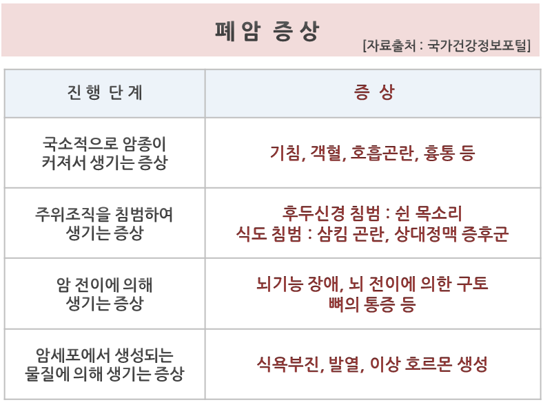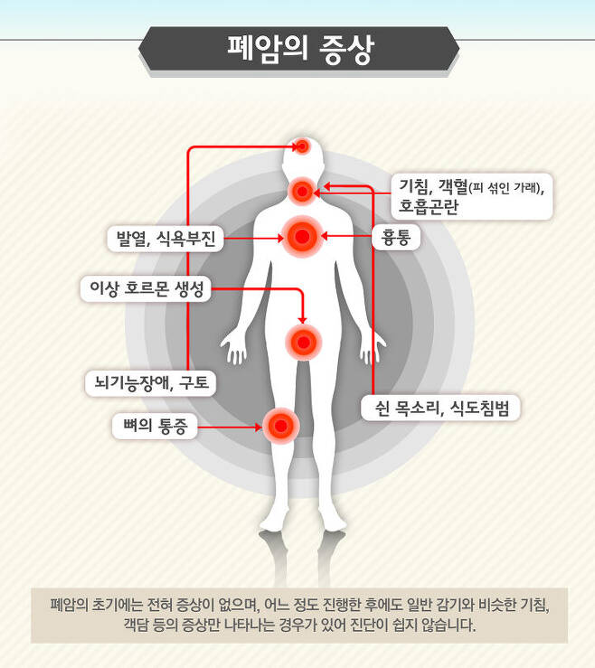 대부분의 다른 암종과 똑같게 폐암도 초기에는 증상이 좀 없기 때문에 주변에서 봐야 되는 이제 병이 진행해봤을 때의 생기는 증상은 많이 보이는 호흡기 증상 중에 일단은 뭐 기침이라든지. 그렇지 아니하면 이제 뭐 가래나 아니라면 각혈 우리가 혈담이라고 재현하는 가래에 섞이는 혈당 그리고 또 진행하다 보면 이제 그런 통증이라든지. 호흡곤란 같은 게 드러날 수있어요.