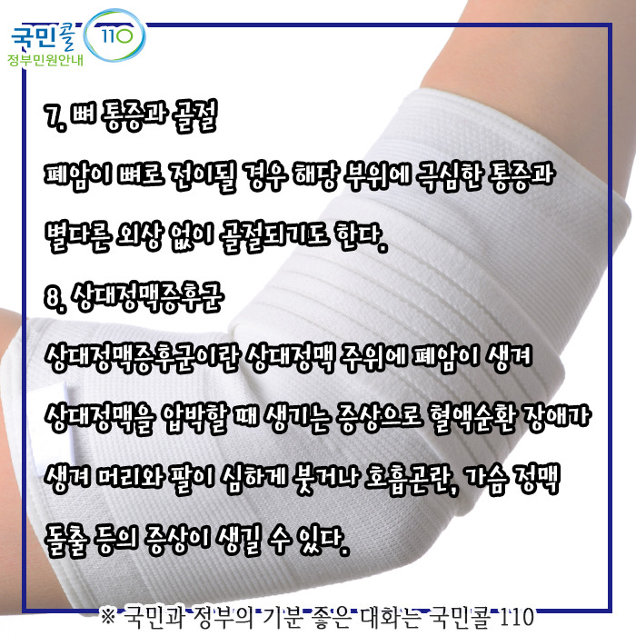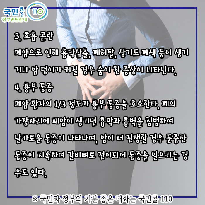 그리고 통증 같은 경우에는 폐에 벽이나 이런 데를 침범하였거나 다른 뼈나 이런 데를 침범하였을 때는 다소 더 병이 진행한 경우인데 통증들이 좀 드러날 수있다하며 그 폐암이 진척하면서 크기 자체가 커지거나 혹은 뭐 물 같은 거를 만들어서 흉수가 차게 되었다거나 이런 때에는 환자분들이 숨을 쉴 때의 통증도 흉막이 자극되면서 생기지만 호흡곤란이 또 같이 발생하게 된다 하였습니다.