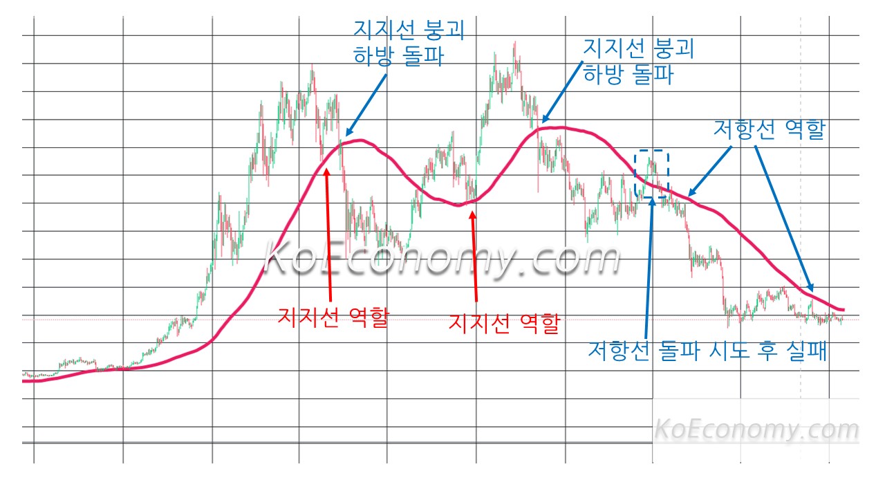 또 다른 활용법은 이동평균선을 지지선과 저항선으로 사용하는 것입니다. 주가가 이동평균선 위에 있으면 지지선으로 작용하며 아래로 떨어지면 저항선 역할을 하죠. 이를 통해 투자자는 매수나 매도 타이밍을 잡을 수 있습니다.