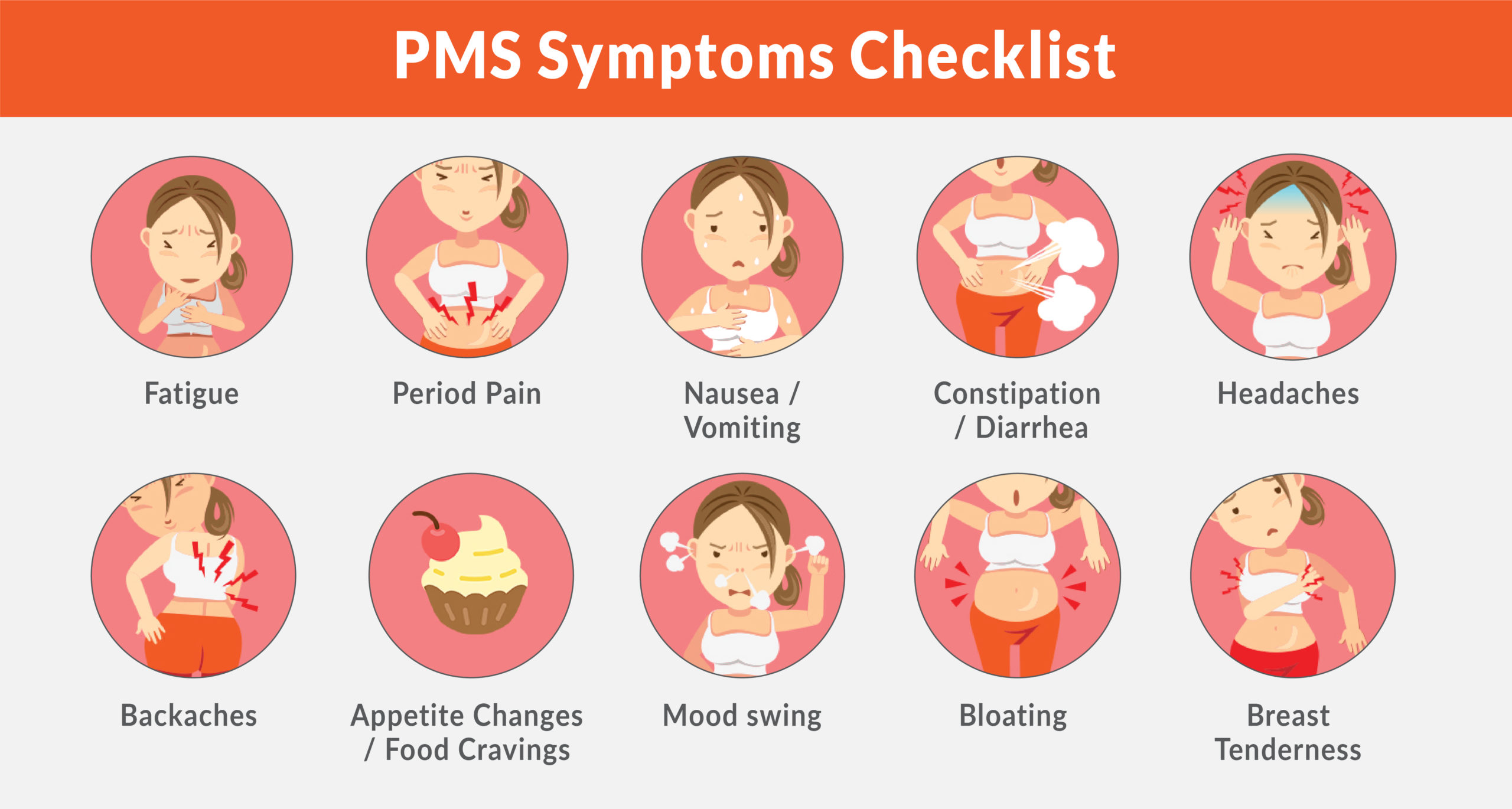 생리전 증후군의 대표적인 증상은 가슴의 부종, 복통, 두통, 피로감, 우울감, 불안감, 식욕변환, 수면장애, 피부변화 등이 있습니다.