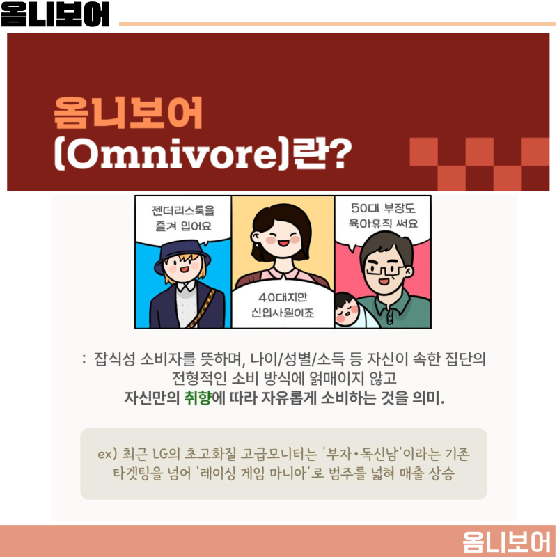 예를 들어, 50대가 육아휴직을 신청하거나, 70대가 유튜브로 연애 팁을 배우는 모습은 옴니보어가 세대 간 벽을 허무는 사례예요.