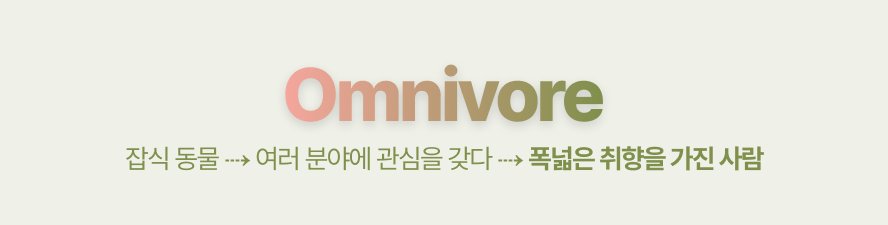 지금 이 순간 여러분도 이미 옴니보어일지 몰라요. 다양한 것을 즐기고, 고정관념을 넘어서며, 자신만의 방식을 살아가는 모두에게 박수를 보냅니다.