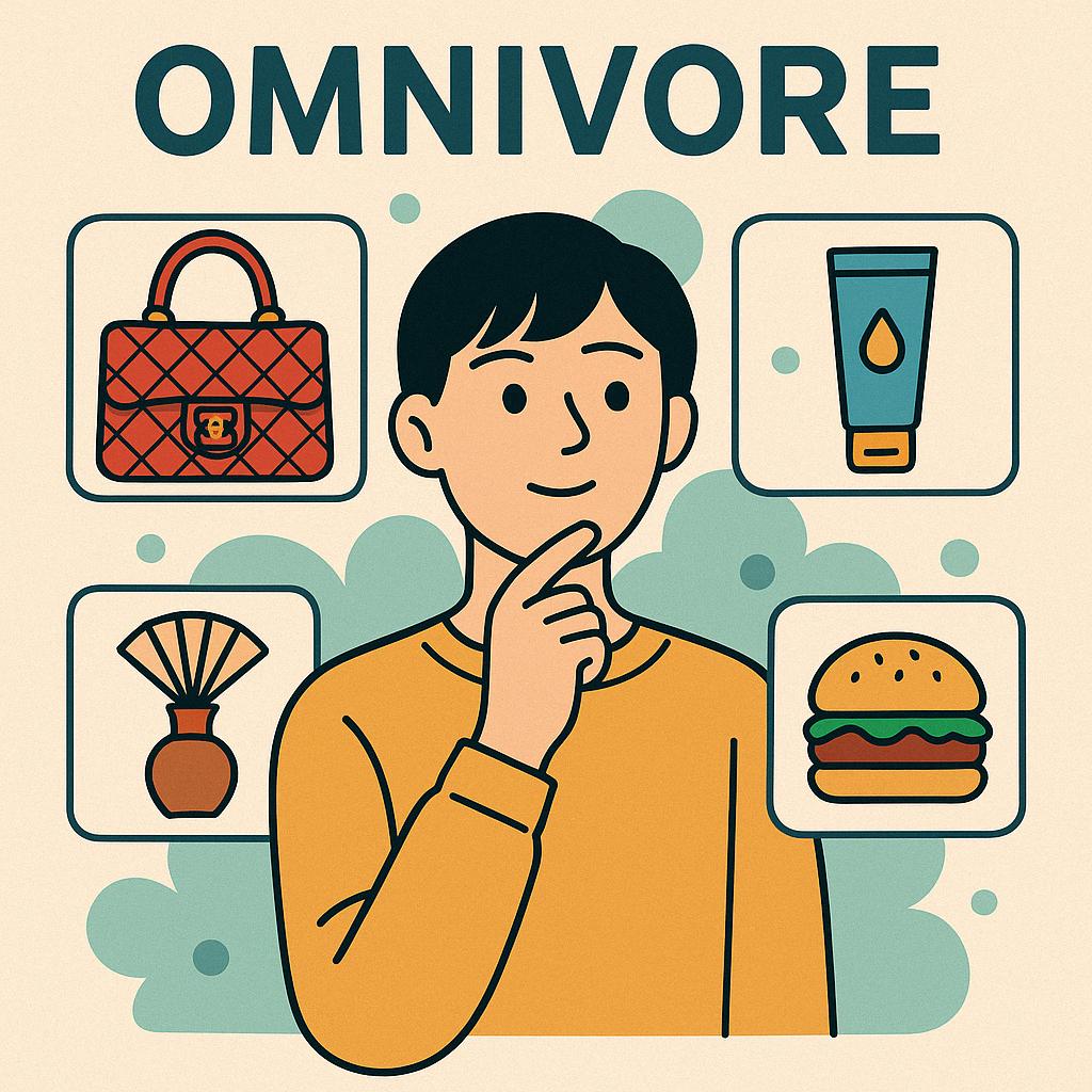 예를 들어, 클래식 음악만 듣던 사람이 갑자기 K-팝이나 힙합까지 즐기거나, 명품과 저가 브랜드를 섞어 입는 이들이 바로 옴니보어예요.